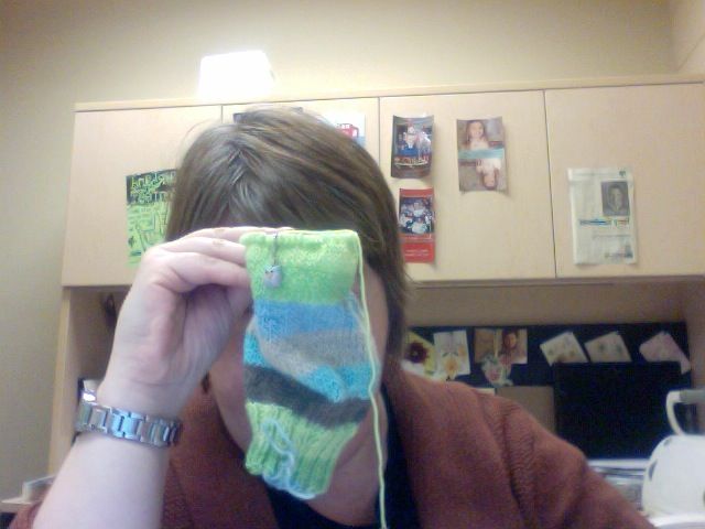 This sock is made from some Knit Picks Felici I think. Anyway, this colorway is probably discontinued. I usually agonize over whether to order a specific Felici colorway until it’s discontinued. Smart planning. Check out the cute owl stitch marker, a gift from new crocheter Catherine Bigbee.